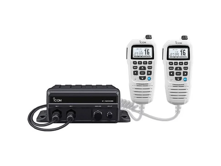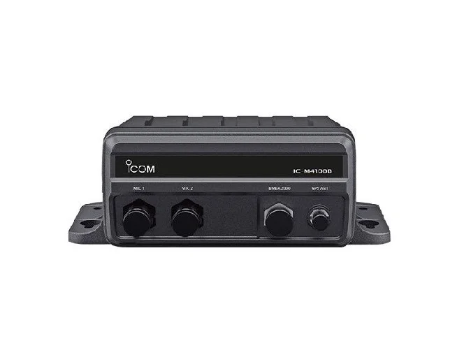 ICOM Black box marine VHF fixed mount with Up to 2 Command Mic Stations | M410BBHigh-Performance Black Box VHF Fixed MountIcom’s M410BB is a flexible black box fixed mount that provides VHF communications for vessels with limited helm space. The supplied CommandMic controls the radio for essential communications on the water.Remote StationsUp to 2One CommandMic included with radio, HM-195GB or HM195GW depending on versionOutput Power25WGPSInternal GPS GNSS Receiver, with external GPS antenna connectionNMEANMEA 2000®/ NMEA 0183® -HSWaterproof RatingIPX7Clean Installation for Limited Helm SpaceThe M410BB consists of a CommandMic and black box RF unit. Use the CommandMic for all operations including DSC. Install the RF unit out-of-sight, place up to 60 ft (18.3 m)* away from the CommandMic.*Two OPC-1541 cables are required for the 60 ft installationCommandMic StationsAdd an additional CommandMic to extend communication points for boats requiring a second comms station. This is ideal for boats needing communication between the cockpit and other locations on the boat. Access the intercom functions for one-to-all or one-to-one communications on the boat.Class D DSC FunctionalityOn the back of every CommandMic is a conveniently located DSC button. Once triggered, the M410BB transmits a DSC alert signal to nearby vessels with the MMSI* and GPS location of your vessel.NMEA200® and NMEA 0183-HS®The NMEA 2000® network provides plug-and-play data communication to inter-connect other marine equipment such as an MFD (Multi-Function Display). The radio can send AIS, GNSS (GPS) position, DSC call, and radio channels to other equipment.Loud One-Way RX HailerThe built-in 15W amplifier increases the audio output of an external hailer speaker. The one-way RX hailer function enables you to broadcast radio traffic through the hailer speaker to listen to radio traffic on the deck or tower. You can also sound foghorn patterns from the hailer speaker.Active Noise CancellingThe Active Noise Cancelling function digitally removes background noise from transmitting and receiving audio to provide clear communications in noisy maritime environments.Other Features:AquaQuake functionAnchor watch functionM510BBM410BBM400BBCommandMic Stations3 stations(up to 2 options)2 stations(optional 1 station)1 stationIntercom functionYesYesNo